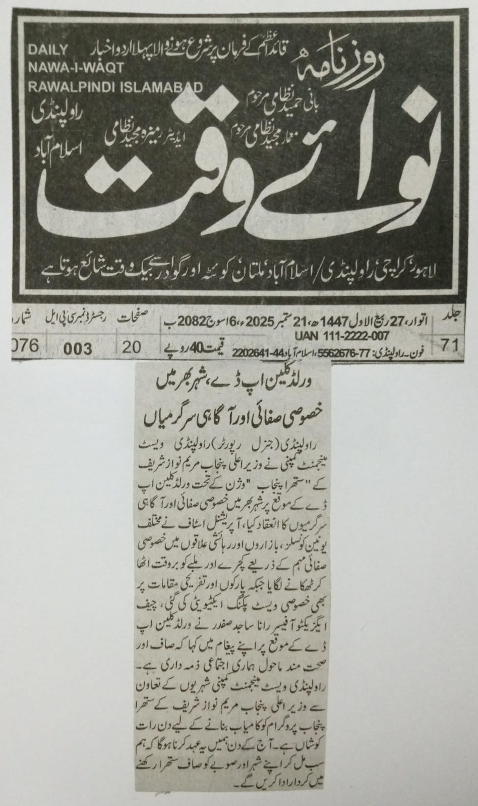صاف ستھرا ماحول پڑھے لکھے اور باشعور معاشرے کی پہچان بھی ہے اور ہمارے مذہب کی تعلیم بھی، نفاست اور پاکیزگی انسان کی فطرت میں شامل ہے۔ ترقی یافتہ ممالک جہاں دیگر شعبوں میں ہمارے لیے مثال ہیں وہیں صفائی اور ستھرائی کے نظام میں ہمارے لئے مشعل راہ ہیں۔ ترقی کی منازل طے کرتے پاکستان میں صفائی ستھرائی کاعالمی اور معیاری نظام شہریوں کے لئے کسی نعمت سے کم نہیں، یونیفارم میں ملبوس متحرک اور فعال عملے کا صبح سویرے شہر بھر کی گلیوں، نالیوں اور راستوں کی صفائی کرنا، گھر گھر سے کوڑا کرکٹ جمع کرکے احتیاط کے ساتھ ٹھکانے لگانا، چند قدم کے فاصلے پر کوڑا دانوں کی تنصیب، ہر یونین کونسل میں کوڑا کرکٹ ڈالنے کی سہولت موجود ہے۔ منیجنگ ڈائریکٹر، راولپنڈی ویسٹ مینجمنٹ کمپنی